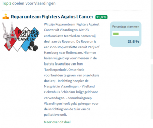 De actie van opticien Specsavers is voor Fighters Against Cancer goed verlopen. Het Roparunteam haalde 21,6% van de stemmen op. De nummer 2 kreeg 20,8% van de stemmen op en de nummer 3 kreeg 17,4% van het publiek achter zich. Het winkelteam van het filiaal in Vlaardingen moet nu een winnaar kiezen uit deze drie doelen. Wij hopen natuurlijk van harte dat de winkel ons zal uitkiezen nadat wij vorig jaar 2e werden achter de scouting uit Schiedam.